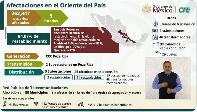La directora de la Comisión Federal de Electricidad (CFE), Emilia Calleja, informó que las lluvias extraordinarias también provocaron afectaciones en el suministro eléctrico, dejando sin servicio a 262 mil personas en Veracruz, Puebla, Hidalgo, San Luis Potosí y Querétaro.