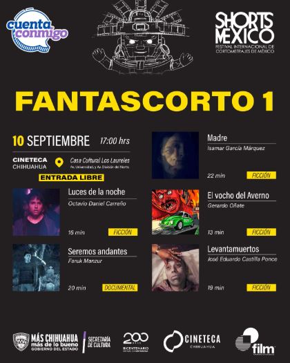 Para el día 10 de septiembre se presentará la colección “Fantascorto 1” desde las 17:00 horas; serán proyectados “Luces de la noche” de Daniel Carreño; “Seremos andantes” de Faruk Manzur; de Isamar García, “Madre”; “El vocho del Averno” de Gerardo Oñate y “Levantamuertos” de Jorge Castilla.