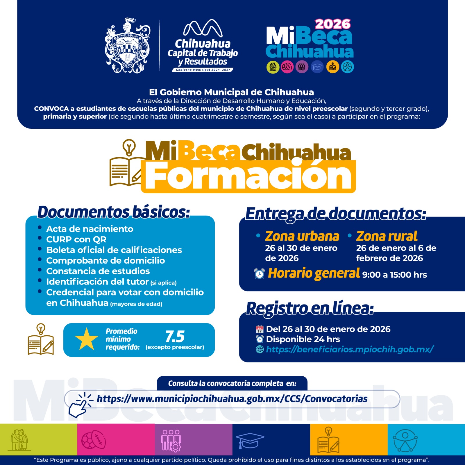 El Gobierno Municipal de Chihuahua, a través de la Dirección de Desarrollo Humano y Educación, invita a estudiantes de escuelas públicas del municipio de Chihuahua de nivel preescolar (segundo y tercer grado), primaria y nivel superior (del segundo al último cuatrimestre o semestre) a participar en el programa Mi Beca Chihuahua Formación 2026, cuyo objetivo es apoyar la permanencia y conclusión de los estudios mediante un apoyo económico.