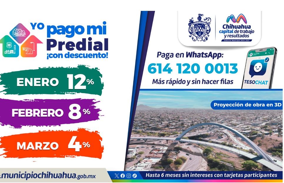 Se puede hacer el pago en línea vía mensaje WhatsApp por medio del TesoChat al teléfono: 614 120 00 13, o a través de la página del municipio: www.municipiochihuahua.gob.mx.