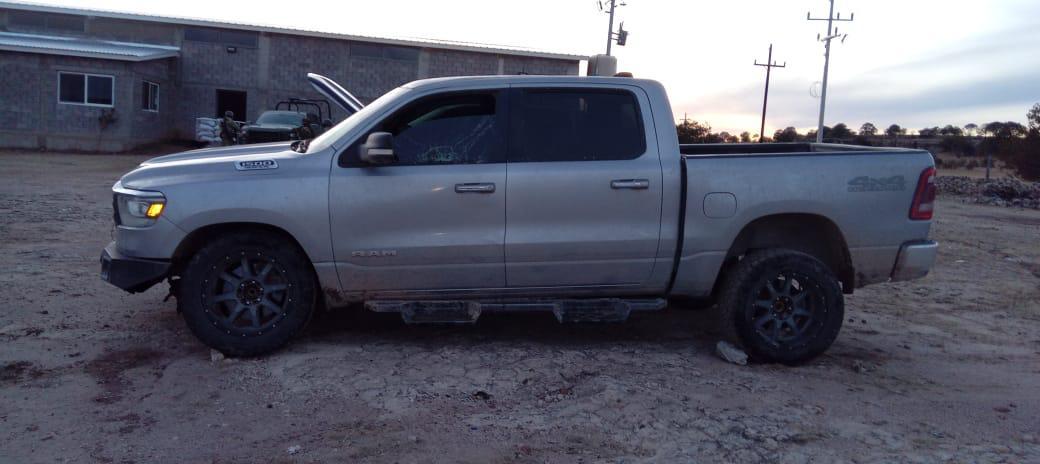 Derivado de la intervención policial, se aseguraron una camioneta RAM 1500 modelo 2022, una GMC Sierra modelo 2021, así como dos pickups RAM 1500 modelo 2019, estas últimas con reporte de robo correspondiente a los años 2023 y 2025, respectivamente.