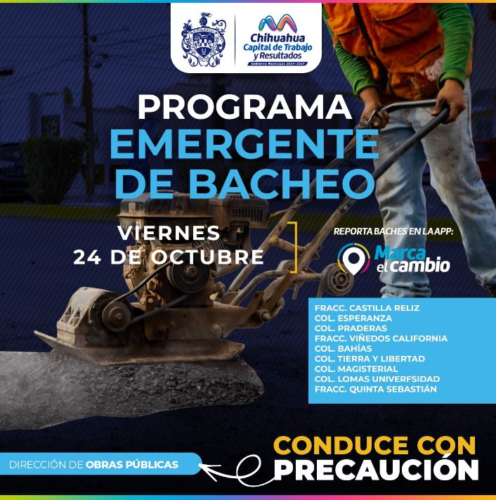 H. Ciudad de Chihuahua, Chih., a 24 de octubre del 2025.- El Gobierno Municipal, a través de la Dirección de Obras Públicas, bacheará este 24 de octubre, mediante el programa emergente, en calles de las colonias Castilla Reliz, Esperanza, Praderas, Viñedos California, Bahías, Tierra y Libertad, Magisterial, Lomas Universidad y en fraccionamiento Quinta Sebastián.