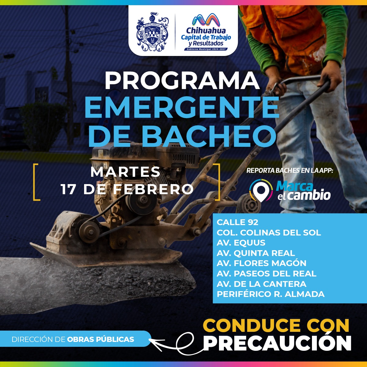El Gobierno Municipal, a través de la Dirección de Obras Públicas, realizará trabajos de bacheo este martes 17 de febrero mediante el programa emergente en la calle 92, colonia Colinas del Sol, así como las avenidas: Equus, Quinta Real, Flores Magón, Paseos del Real y De la Cantera además del periférico R. Almada