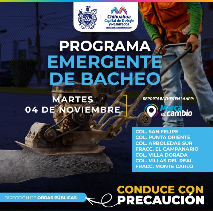 H. Ciudad de Chihuahua, Chih., a 4 de noviembre del 2025.- El Gobierno Municipal, a través de la Dirección de Obras Públicas, bacheará este 4 de noviembre, mediante el programa emergente, en calles de las colonias San Felipe, Punta oriente, Arboledas Sur, Campanario, Villa Dorada, Villas del Real y Monte Carlo.