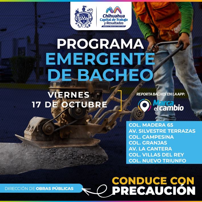 H. Ciudad de Chihuahua, Chih., a 17 de octubre del 2025.- El Gobierno Municipal, a través de la Dirección de Obras Públicas, llevará a cabo trabajo de bacheo este 17 de octubre, mediante el programa emergente, en calles de las colonias: Madera 65, Av. Silvestre Terrazas, Campesina, Granjas, Av. La Cantera, Villas del Rey y Nuevo Triunfo.