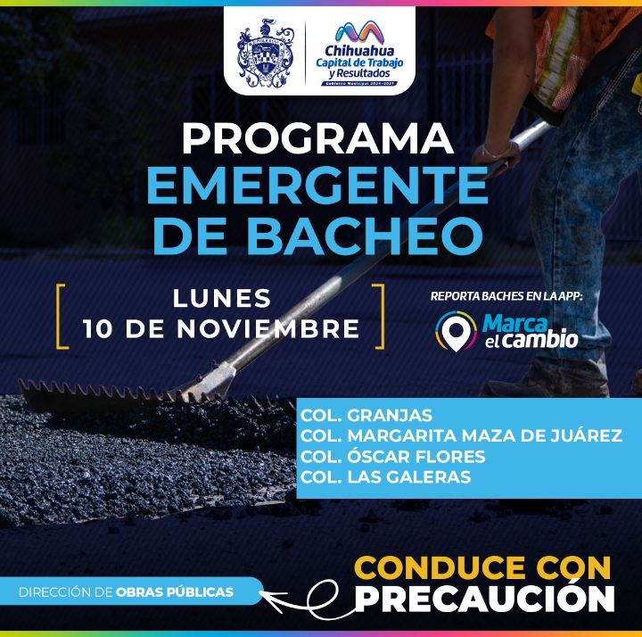 H. Ciudad de Chihuahua, Chih., a 10 de noviembre del 2025.- El Gobierno Municipal, a través de la Dirección de Obras Públicas, realizará trabajos de bacheo este 10 de noviembre, mediante el programa emergente en calles de las colonias: Granjas, Margarita Maza de Juárez, Óscar Flores y Las Galeras.