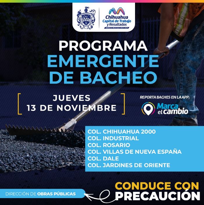 H. Ciudad de Chihuahua, Chih., a 13 de noviembre del 2025.- El Gobierno Municipal, a través de la Dirección de Obras Públicas, realizará trabajos de bacheo este 13 de noviembre, mediante el programa emergente en calles de las colonias: Chihuahua 2000, Industrial, Rosario, Villas de Nueva España, Dale y Jardines de Oriente.