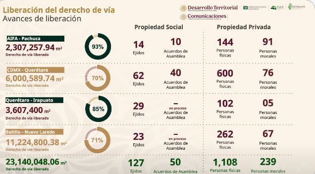 El titular de Vinculación Institucional y Patrimonio de la SICT, Néstor Núñez López, informó que la liberación del derecho de vía presenta los siguientes avances: