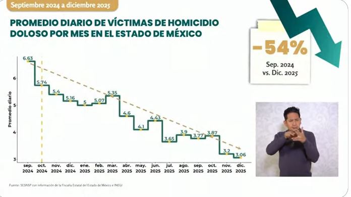 La titular del Secretariado Ejecutivo del Sistema Nacional de Seguridad Pública, Marcela Figueroa, informó de los homicidios dolosos se redujeron en el Estado de México en los últimos 15 meses, 54 por ciento, al pasar de 6.63 homicidios diarios en septiembre de 2024 a 3.06 al día diario, en promedio, en diciembre de 2025.