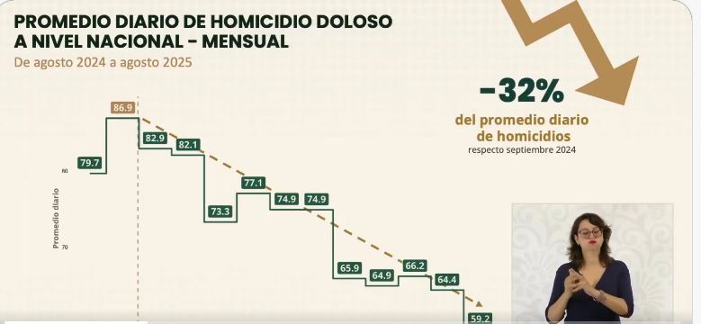 Marcela Figueroa Franco, titular de la Secretaría Ejecutiva del Sistema Nacional de Seguridad Pública, informó que en agosto de 2025 el delito de homicidio doloso registró una disminución del 32 por ciento en comparación con septiembre de 2024 en México.