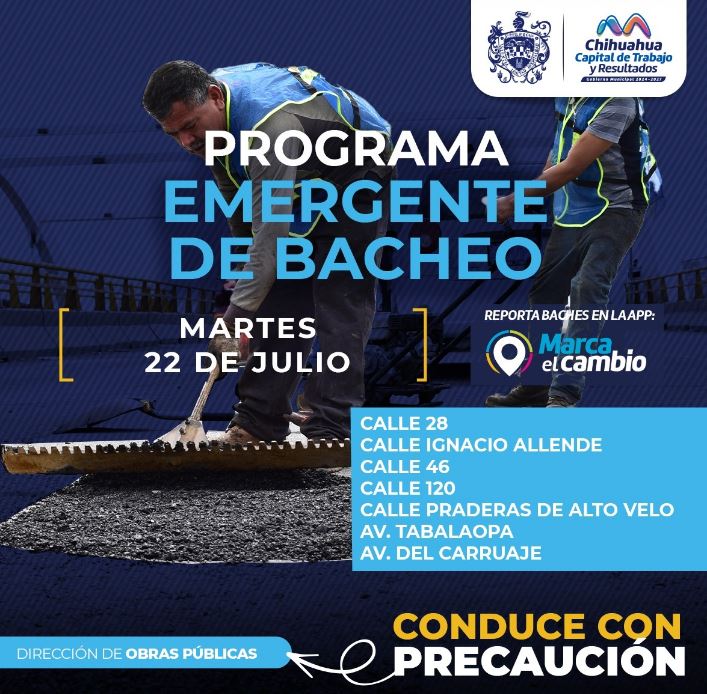 H. Ciudad de Chihuahua, Chih., a 22 de julio del 2025.- El Gobierno Municipal, a través de la Dirección de Obras Públicas, bacheará este 22 de julio mediante el programa emergente en las calles 28, Ignacio Allende, 46, 120 y Praderas de Alto Velo, así como en las avenidas Del Carruaje y Tabalaopa.