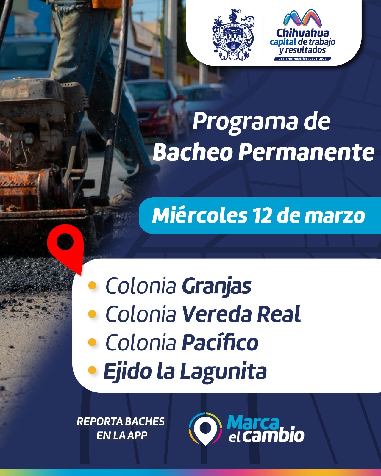 Chihuahua, Chih. A 12 de marzo del 2025.- El Gobierno Municipal, a través de la Dirección de Obras Públicas, continúa dando atención a los reportes que realizan los ciudadanos a través del Centro de Respuesta Ciudadana y en la aplicación Marca el Cambio, por lo que hoy trabajarán en las colonias Granjas, Vereda Real, Pacífico y Ejido la Lagunita.