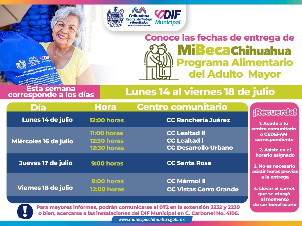 H. Ciudad de Chihuahua, Chih. A 13 de julio de 2025.- En atención al compromiso que el Gobierno Municipal tiene con las y los adultos mayores de Chihuahua Capital, para garantizarles una mejor calidad de vida, a través del DIF, se informa a las y los solicitantes del Programa Alimentario del Adulto Mayor (PAAM) los centros comunitarios y horarios en los que podrán acudir por su paquete alimentario del 14 al 18 de julio.