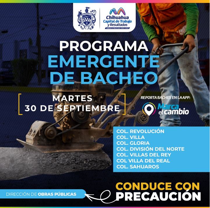 H. Ciudad de Chihuahua, Chih., A 30 de septiembre del 2025.- El Gobierno Municipal, a través de la Dirección de Obras Públicas, trabajará con bacheo este 30 de septiembre, mediante el programa emergente, en las colonias Revolución, Villa, Gloria, División del Norte, Villas del Rey, Villa del Real y Sahuaros.