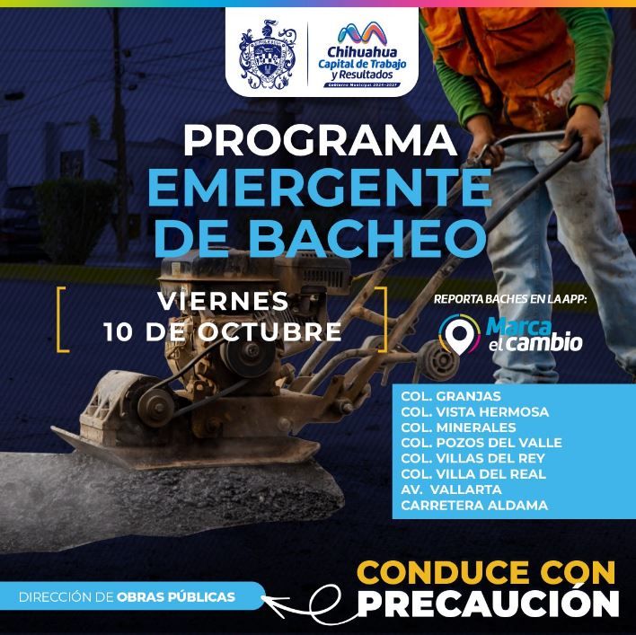 H. Ciudad de Chihuahua, Chih., a 10 de octubre del 2025.- El Gobierno Municipal, a través de la Dirección de Obras Públicas, trabajará con bacheo este 9 de octubre, mediante el programa emergente, en calles de las colonias: Granjas, Vista Hermosa, Minerales, Pozos del Valle, Villas del Rey, Villa del Real, así como en la avenida Vallarta y la carretera Aldama.