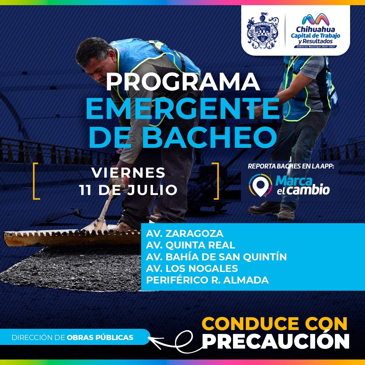 H. Ciudad de Chihuahua, Chih. A 11 de julio del 2025.- El Gobierno Municipal a través de la Dirección de Obras Públicas, realizará trabajos de bacheo mediante el programa emergente en las avenidas Zaragoza, Quinta Real, Bahía de San Quintín y Los Nogales, así como en el periférico Francisco R. Almada.