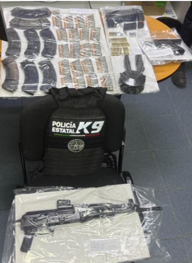 De manera posterior, se desplegó personal del grupo K9, lo que permitió que uno de los ejemplares caninos, de nombre Acre, localizara otra arma de fuego en un terreno baldío aledaño, zona por la que presuntamente huyeron los demás ocupantes del vehículo.