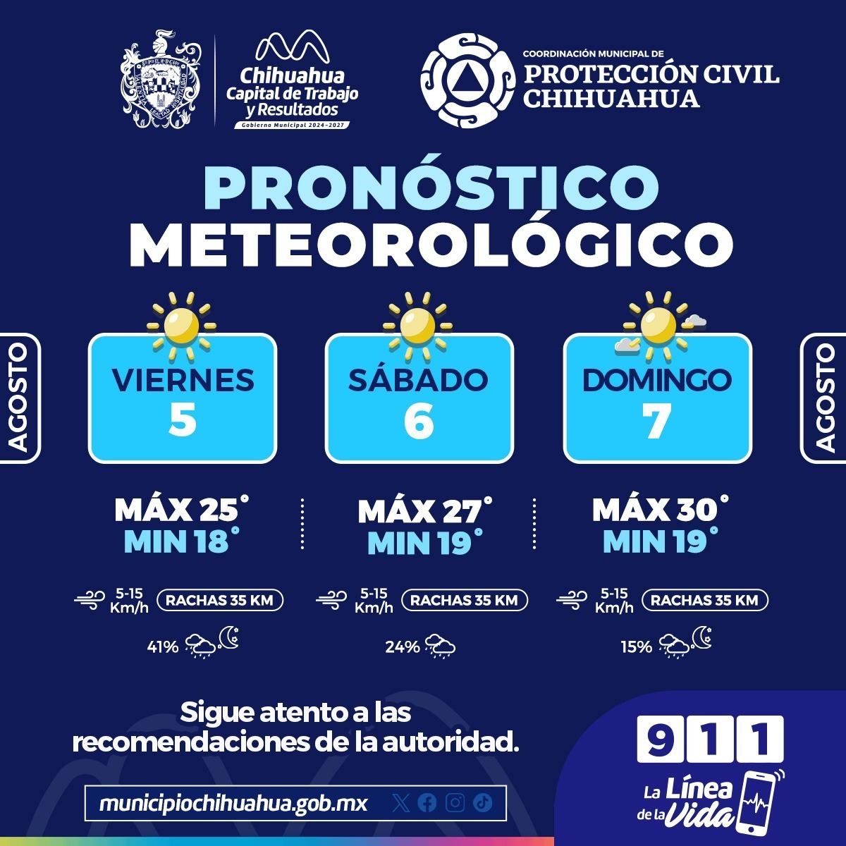 H. Ciudad de Chihuahua, Chih., a 5 de septiembre de 2025.- La Coordinación Municipal de Protección Civil, informa que, para este fin de semana del 5 al 7 de septiembre, se esperan días nublados con probabilidad de lluvia en distintos momentos del día.