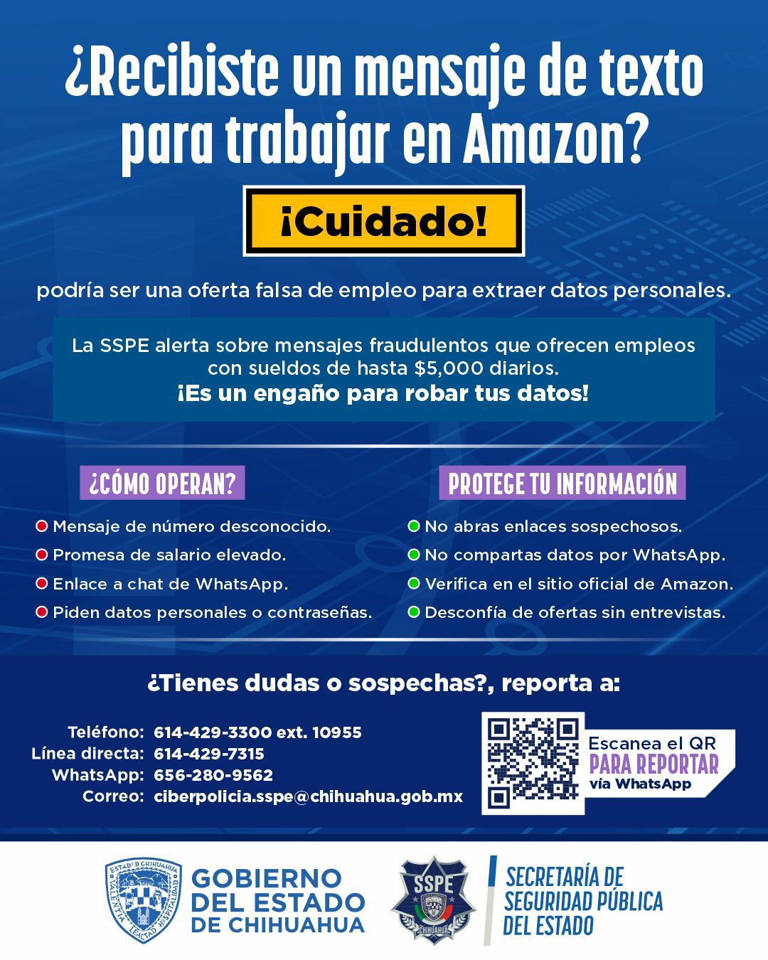 Ante cualquier duda o sospecha, pueden llamar al 614-429-3300 ext. 10955, al número directo 614-429-7315, vía WhatsApp 656-280-9562, o al correo ciberpolicia.sspe@chihuahua.gob.mx.