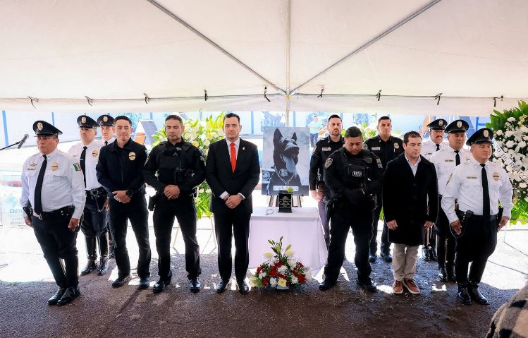 El alcalde Marco Bonilla, encabezó una guardia de honor para despedir y reconocer el heroísmo de Vico, perro policía que falleció en cumplimiento del deber tras durante un operativo de atención de violencia familiar en un domicilio ubicado “La Cuadrilla” en el Ejido el Fresno.