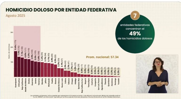 Pese a ocupar los primeros lugares en número de asesinatos por entidad federativa, todas reportan una disminución en la frecuencia con que ocurre este delito desde el inicio de la administración de la presidenta Claudia Sheinbaum.