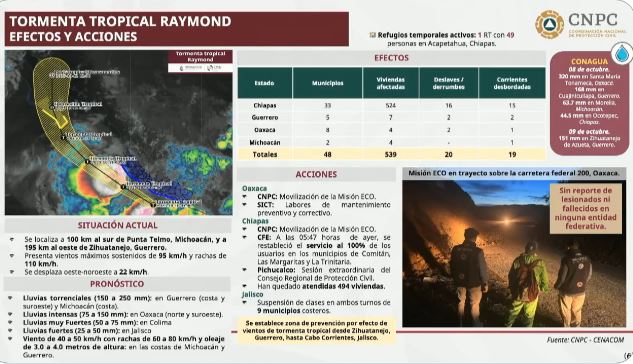 La titular de la Coordinación Nacional de Protección Civil (CNPC), Laura Velázquez Alzúa, informó que la tormenta tropical Raymond tiene una trayectoria paralela a las costas mexicanas en el océano Pacífico, por lo que está afectando con lluvias intensas a diversos estados, entre ellos Jalisco, Colima, Michoacán, Guerrero y Nayarit.