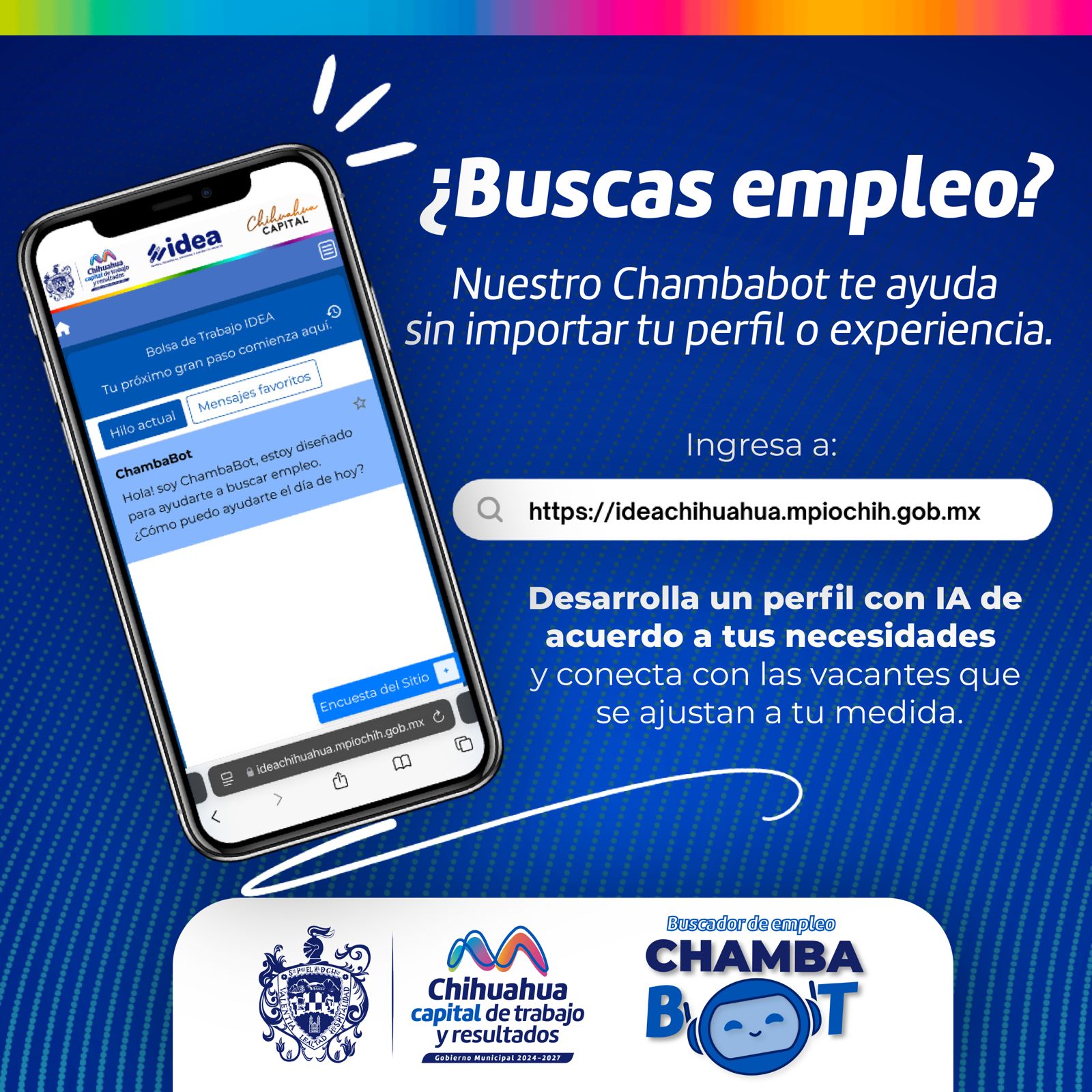 Chihuahua, Chih. A 13 de febrero de 2025_.- El alcalde Marco Bonilla tiene un especial interés en hacer de Chihuahua Capital una ciudad competitiva en la que todas y todos puedan desarrollarse de manera integral, es por ello que con el objetivo de facilitar a la ciudadanía la búsqueda de trabajo y las consultas en páginas de bolsas de trabajo o redes sociales, el Gobierno Municipal creó el buscador de empleo virtual “ChambaBot”.