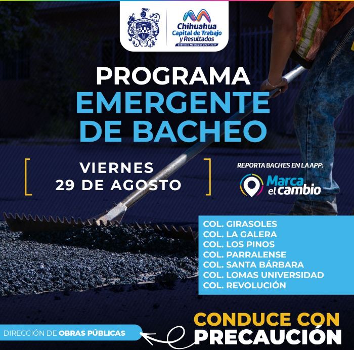 H. Ciudad de Chihuahua, Chih., a 29 de agosto del 2025.- El Gobierno Municipal, a través de la Dirección de Obras Públicas, bacheará hoy 29 de agosto, mediante el programa emergente, en las colonias Girasoles, La Galera, Los Pinos, Parralense, Santa Bárbara, Lomas Universidad y Revolución.