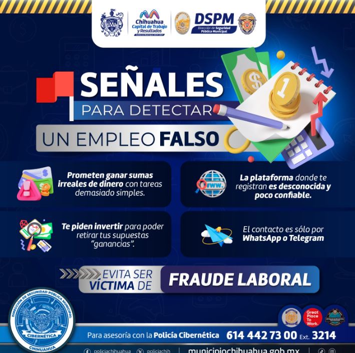 H. Ciudad de Chihuahua, Chih., a 29 de septiembre de 2025.- La Dirección de Seguridad Pública Municipal (DSPM), a través de la Policía Cibernética, alerta a la ciudadanía sobre las principales señales para identificar propuestas de empleo falsas y prevenir ser víctima de fraude.