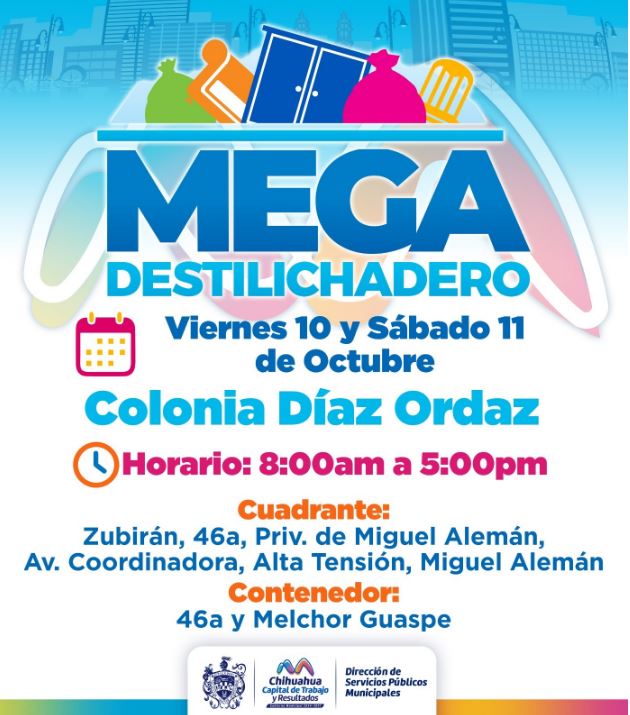 H. Ciudad de Chihuahua, Chih., a 7 de octubre de 2025.- Con el objetivo de evitar acumulación de tiliches en la vía pública, así como en las viviendas, el Gobierno Municipal, a través de la Dirección de Servicios Públicos Municipales, llevará un Mega Destilichadero a la colonia Díaz Ordaz este próximo viernes 10 y sábado 11 de octubre.