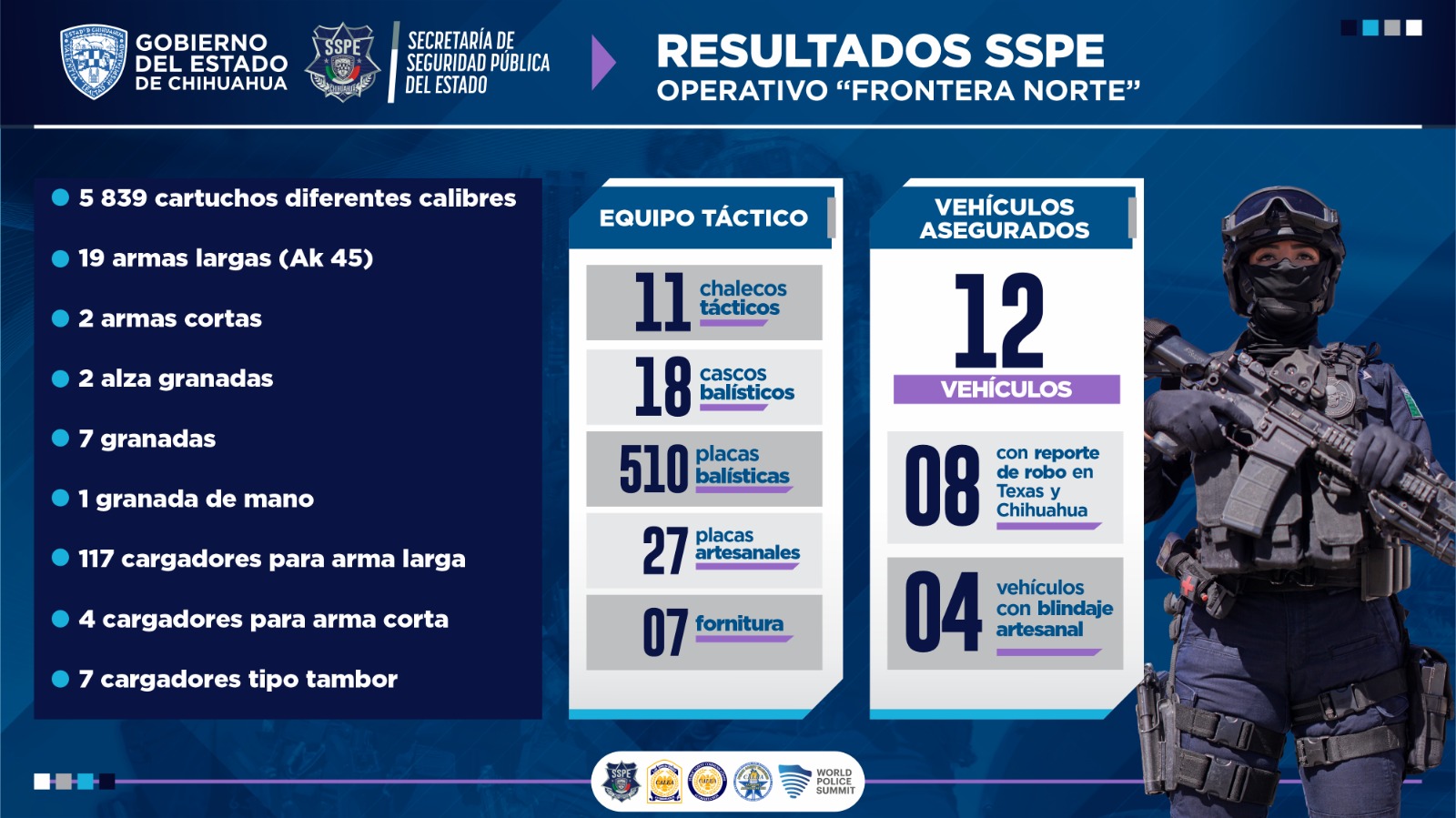 Derivado del operativo de vigilancia y disuasión del delito desplegado en el municipio de Namiquipa, la Secretaría de Seguridad Pública del Estado (SSPE), a través de la Fuerza Especial SWAT, llevó a cabo la inhabilitación de una casa de seguridad, en la cual se aseguraron 16 vehículos, equipo táctico, 21 armas de fuego y más de 5 mil 830 cartuchos útiles.