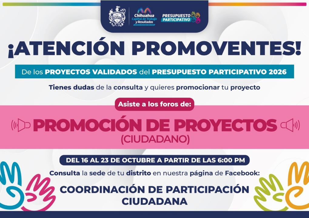H. Ciudad de Chihuahua, Chih., a 16 de octubre del 2025.- El Gobierno Municipal, a través de la Coordinación de Participación Ciudadana, invita promoventes que probaron sus propuestas para el “Presupuesto Participativo 2026”, a asistir a los Foros de Promoción de Proyectos.