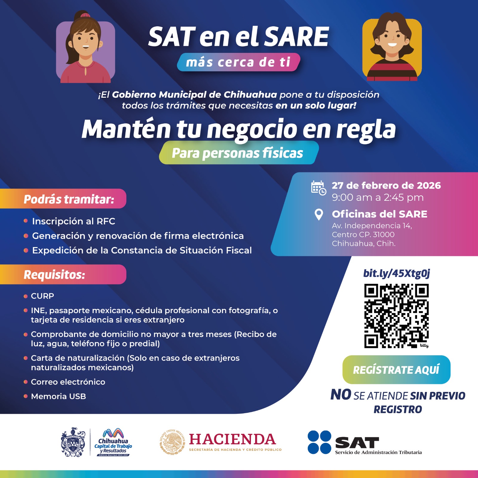 El Gobierno Municipal de Chihuahua, a través de la Dirección de Desarrollo Económico y Competitividad en colaboración con el Servicio de Administración Tributaria (SAT), informa a la población que el próximo viernes 27 de febrero podrán realizar trámites fiscales y administrativos para personas físicas en las instalaciones del SARE.