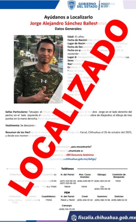 Mediante la aplicación de los protocolos de búsqueda y el trabajo de investigación ministerial, la Fiscalía de Distrito Zona Sur, localizó sano y salvo a Jorge Alejandro S. B., quien tenía reporte de ausencia interpuesto el 01 de noviembre del presente año, en la ciudad de Parral.