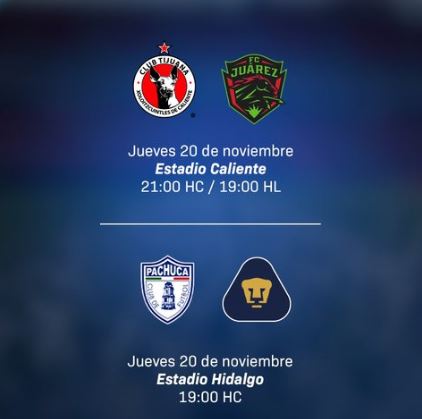 Los duelos del Play-In Pachuca-Pumas y Tijuana-Juárez del Apertura 2025 se disputarán el jueves 20 de noviembre a partido único. En caso de empate en tiempo reglamentario todo se definirá directo en tanda de penaltis.