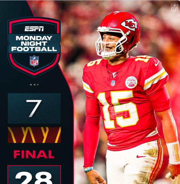 Patrick Mahomes conectó tres pases de anotación en el triunfo de los Kansas City Chiefs 28-7 sobre los Washington Commanders en partido que cerró la semana ocho de la temporada de la NFL.