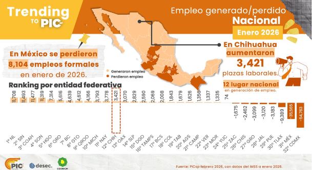 El estado de 𝗖𝗵𝗶𝗵𝘂𝗮𝗵𝘂𝗮 𝘀𝗲 𝗽𝗼𝘀𝗶𝗰𝗶𝗼𝗻𝗼́ 𝗲𝗻 𝗲𝗹 𝗹𝘂𝗴𝗮𝗿 𝟭𝟮 entre los estados que generaron empleo con 3,421 plazas añadidas y presentó una 𝗿𝗲𝗰𝘂𝗽𝗲𝗿𝗮𝗰𝗶𝗼́𝗻 𝗱𝗲𝗹 𝟭𝟵% respecto a los empleos perdidos de diciembre de 2025.