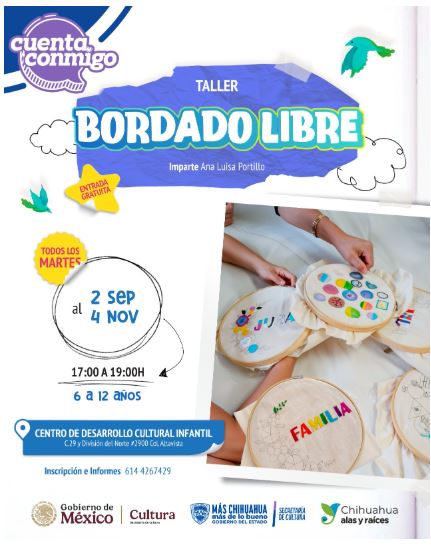 El taller de Bordado Libre, esta dirigido a niñas y niños de 6 a 12 años y se trata de un espacio seguro donde las infancias podrán expresarse con hilos, reflexionar sobre el cuidado del medio ambiente y divertirse todos los martes a partir del 2 de septiembre de 17:00 a 19:00 horas.