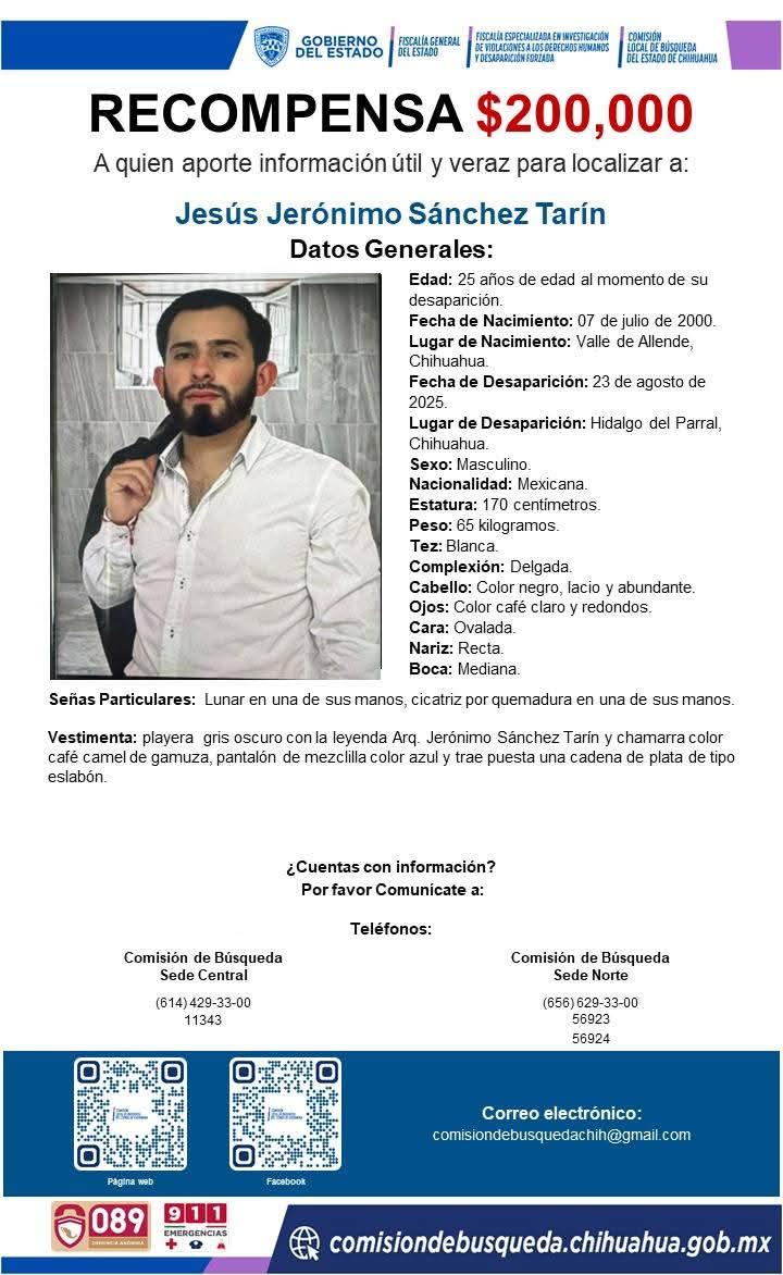 La Comisión Local de Búsqueda, en coordinación con la Fiscalía de Distrito Zona Sur, ofrece recompensa de 200 mil pesos a quien proporcione información veraz, útil y comprobable, que contribuya a la localización de Jesús Gerónimo Sánchez Tarín y otros 200 mil pesos, por información para encontrar a Jaime Leónides Cano Sotelo, quienes fueron reportados como desaparecidos el 23 de agosto de 2025, en la ciudad de Parral.