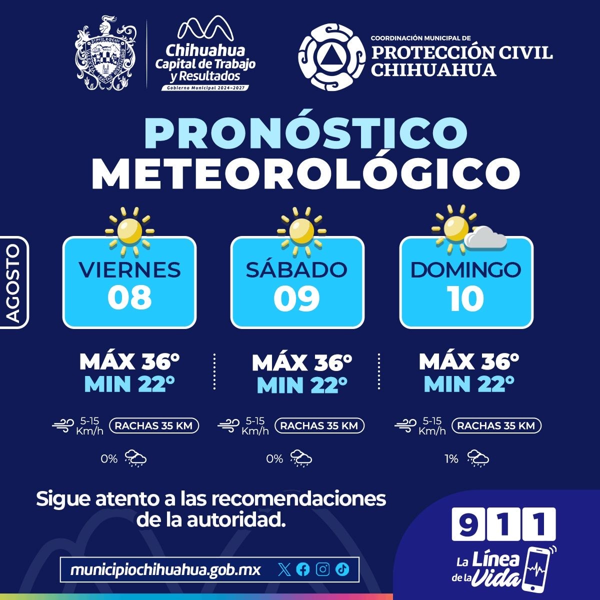 H. Ciudad de Chihuahua, Chih. A 8 de agosto de 2025.- La Coordinación Municipal de Protección Civil informa que el pronóstico del clima para este fin de semana, con base en datos del Servicio Meteorológico Nacional, será de hasta 36°C como temperaturas máximas.