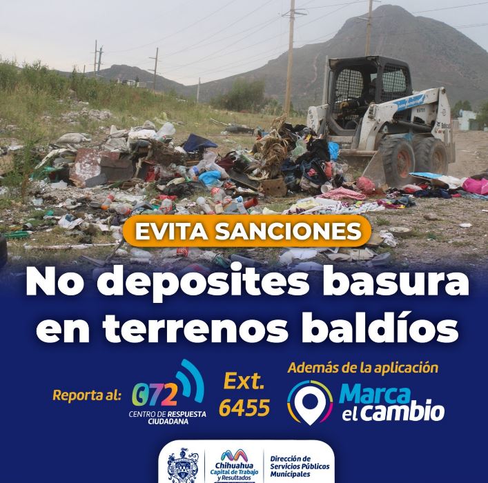 H. Ciudad de Chihuahua, Chih., a 18 de diciembre de 2025.- Con el objetivo de mantener una buena imagen urbana, el Gobierno Municipal a través de la Dirección de Servicios Públicos Municipales, hace un exhorto a la población en general a evitar tirar basura o escombro en viviendas abandonadas y terrenos baldíos de la ciudad.