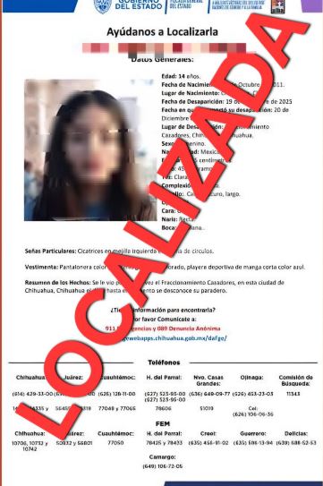 H. Ciudad de Chihuahua, Chih. 21 de diciembre de 2025.- Policías municipales localizaron la tarde del sábado a una menor de edad con iniciales R. B. R. M., que se habría ausentado de su casa en la colonia Cazadores un día antes, el viernes 19 del presente mes.