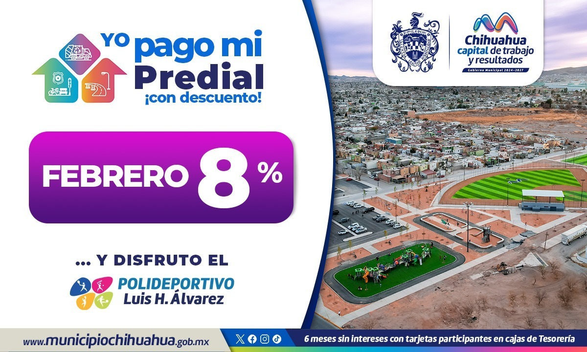 Chihuahua, Chih. A 13 de febrero de 2025.- Si aún no estas al corriente con el pago de tu Impuesto Predial, el Gobierno Municipal recuerda que todo el mes de febrero se tiene el 8 por ciento de descuento para personas físicas y morales.