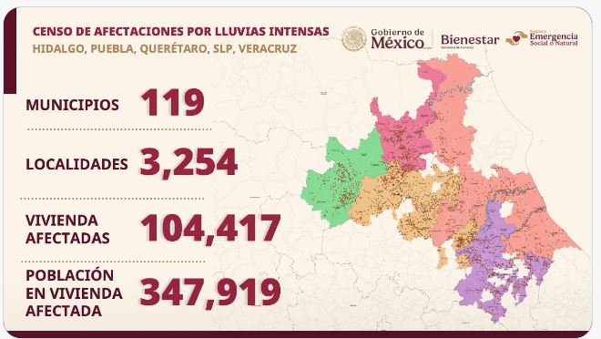 Con relación a las localidades afectadas, Montiel dijo que fueron 3,254 en 119 municipios, en Hidalgo, Querétaro, Puebla, San Luis Potosí y Veracruz.