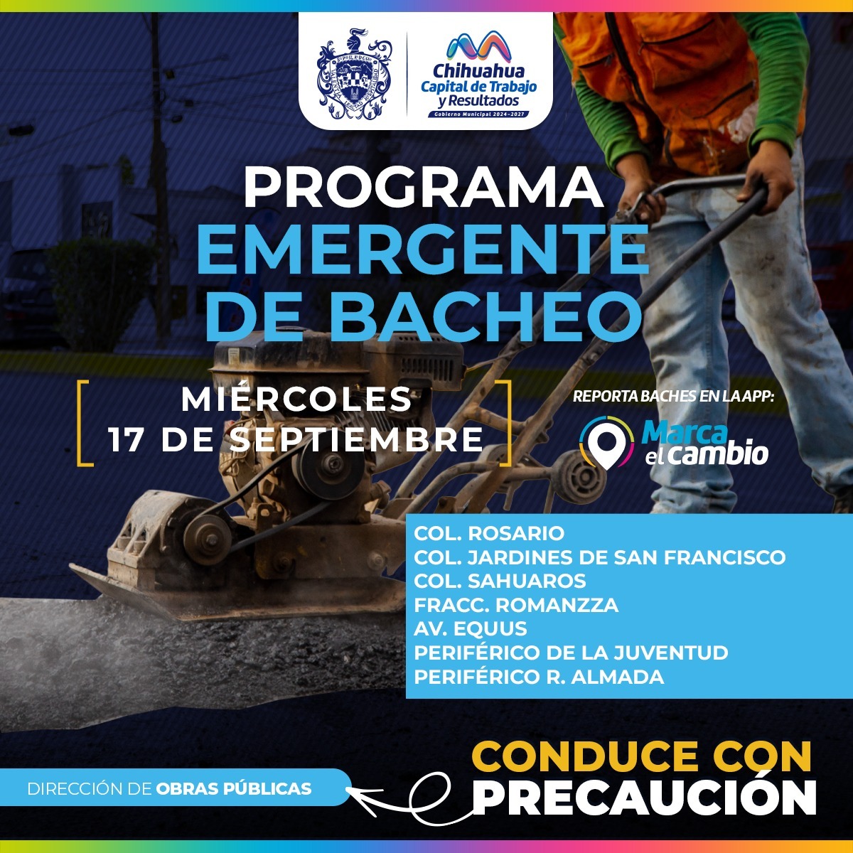 H. Ciudad de Chihuahua, Chih., a 17 de septiembre del 2025.- El Gobierno Municipal, a través de la Dirección de Obras Públicas, realizará trabajos de bacheo mediante el programa emergente en las colonias: Rosario, Jardines de San Francisco, Sahuaros y Fraccionamiento Romanzza, así como en la avenida Equus y en los periféricos: de la Juventud y R. Almada.