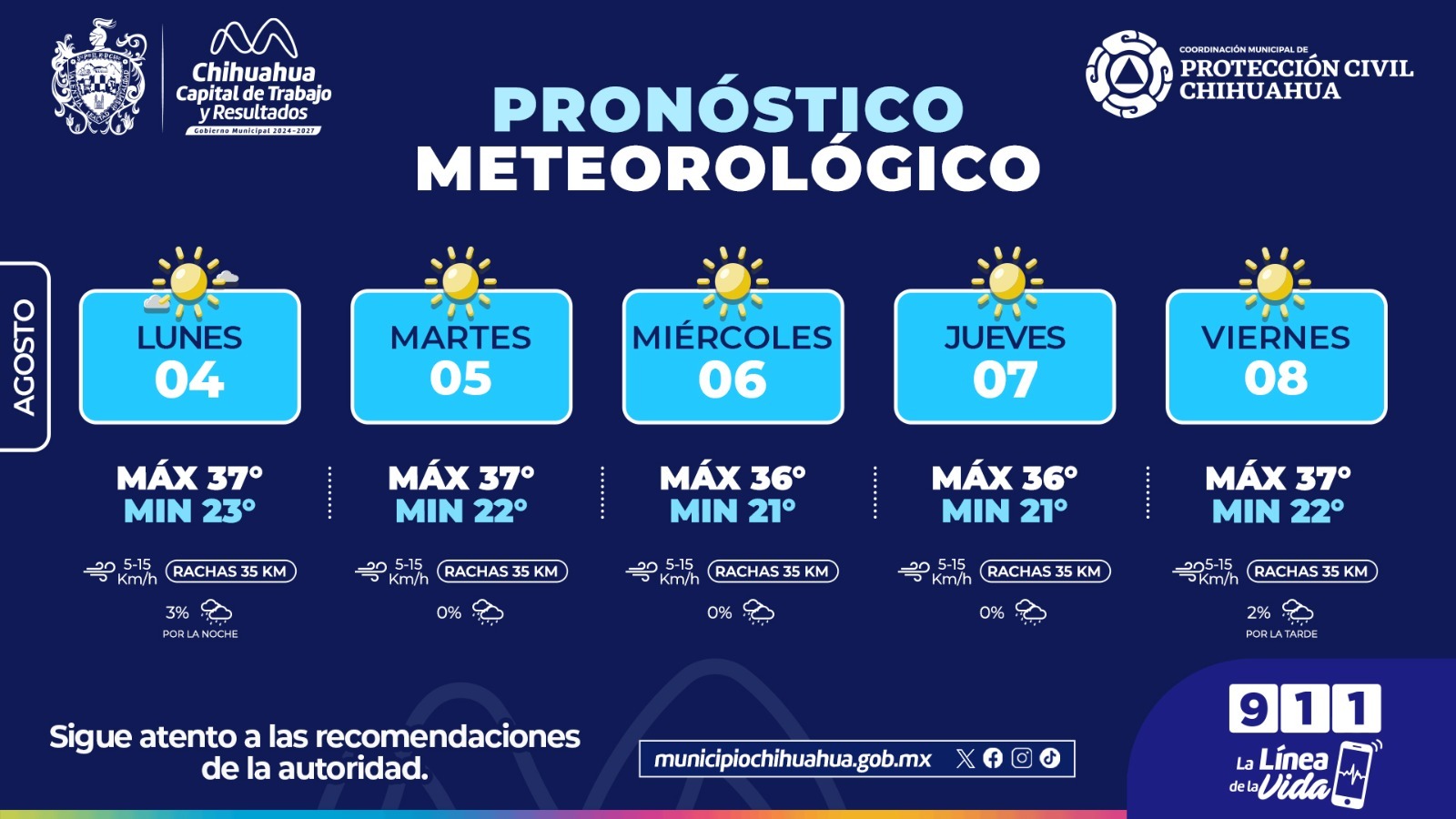H. Ciudad de Chihuahua, Chih. A 4 de agosto de 2025.- El Gobierno Municipal de Chihuahua, a través de la Coordinación Municipal de Protección Civil, informa que durante esta semana se mantendrán condiciones variables en el clima, con cielos soleados, tardes calurosas y mínimas probabilidades de lluvia.