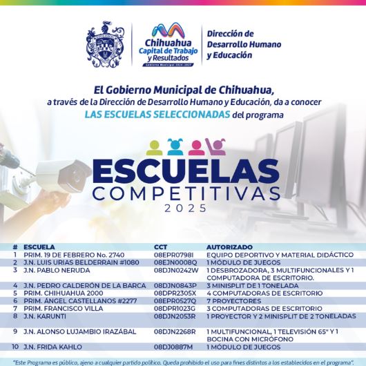 El Gobierno Municipal, a través de la Dirección de Desarrollo Humano y Educación, publicó la lista de escuelas aceptadas en el programa “Escuelas Competitivas 2025”.