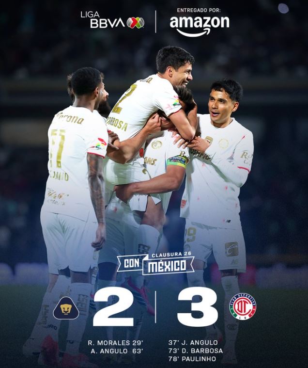 Pumas perdió esta noche el duelo de invictos ante el Toluca en el Estadio Olímpico Universitario en partido de la Jornada 9 del Clausura 2026 (2-3).