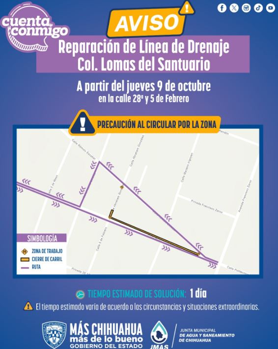 Asimismo, la JMAS Chihuahua llama a los automovilistas a respetar en todo momento los señalamientos que se colocarán en el área, así como a conducir con precaución para evitar accidentes.