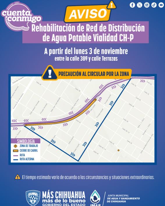 La Junta Municipal de Agua y Saneamiento (JMAS) de Chihuahua dio a conocer que el día de hoy, 3 de noviembre, dará inicio la reposición de la línea hidráulica que se ubica sobre la vialidad Ch-P, entre las calles 46ª y 38ª, a fin de mejorar el servicio que se brinda en la zona.